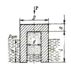 Задача (Куколевский И.И.) 1.33. Определить массу m толстостенного колокола размерами D = 0,4 м, и d = 0,2 м, L = 1 м, а = 0,1 м, если он плавает в воде при погружении Н = 0,6 м. При какой добавочной нагрузке Р колокол целиком погрузится в воду? При решении задачи давление воздуха в колоколе перед погружением считать равным атмосферному (Pат = 98 кПа), а процесс сжатая воздуха при погружении - изотермическим.