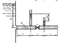 Задача (Куколевский И.И.) 9.42. Вода вытекает из бака в атмосферу по горизонтальной трубе, на которой установлены два пьезометра. Диаметр трубы d = 50 мм, длина каждого из трех ее участков, разделенных пьезометрами, l = 4 м. 1) Определить напор Н в баке и расход Q воды, если известно что при полностью открытой задвижке (? = 0), установленной на участке между пьезометрами, разность их показаний ?h = 3 м. Шероховатость трубы ? = 0,5 мм, кинематическая вязкость воды v = 1 сСт. 2) Как изменятся расход и разность показаний ?h при том же напоре в баке, но частично прикрытой задвижке (? = 30). Потерей напора при входе в трубу пренебречь. В обоих случаях построить графики напоров подлине трубы,