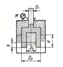 Задача (Куколевский И.И.) 1-32 Определить массу т колокола, имеющего диаметры D1 =0,1 м, D2 = 0,2 м. D3 = 0,4 м, если глубина его погружения в волу при плавании в закрытом сосуде Н = 0,3 м, подъел уровня воды внутри колокола h = 0,1 м, а избыточное давление на поверхности воды вне колокола М = 20 кПа.