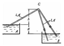 Задача (Куколевский И.И.) 10-5. Определить расход Q воды (v = 0,01 Ст), поступающий под напором H = 5 м из резервуара A в резервуар В по сифонному трубопроводу, состоящему из стальных (? = 0,2 мм) труб диаметрами d = 100 мм и длинами L = 100 м.