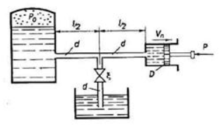 Задача (Куколевский И.И.) 10.37. Поршень гидравлического цилиндра, имеющий диаметр D = 60 мм и нагруженный внешней силой Р = 2250 Н, перемещается под давлением масла (б = 0,815, V = 0,5 Ст), поступающего в цилиндр из пневмогидравлического аккумулятора по магистральной трубе (l = 20 м, d = 15 мм). 1) Определить, при каком коэффициенте сопротивления С дросселя на сливной трубе (диаметром с1 = 15 мм), присоединенной к магистрали в середине ее длины, скорость поршня будет vn= 0,2м/с, если избыточное давление в аккумуляторе P0 = 1,35 МПа. Разностью высот расположения агрегатов системы и местными потерями напора в магистральной трубе пренебречь. В сливной трубе учитывать только сопротивление дросселя. 2) Какова будет скорость поршня, если полностью закрыть дроссель на сливной трубе? 3) При каком минимальном значении ^ дросселя поршень остановится?