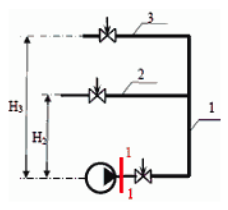 Насос подает керосин в трубопровод. Размеры труб d1 = 82 мм, l1 = 53 м, d2 = d3 = 62 мм, l2 = l3 = 55 м, шероховатость Δ = 0,5 мм, коэффициент сопротивления вентиля ζ = 5, высоты расположения выходных сечений H2 = 4,6 м, H3 = 5,3 м. Расход насоса Q1 = 0,04 м3/с. Определить: 1) расходы жидкости на участках 2 и 3; 2) давления на выходе из насоса (в сечении 1-1); 3) при каких значениях диаметров d2 и d3расходы на участках 2 и 3 будут равны?