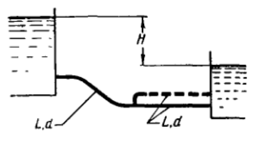 Задача (Куколевский И.И.) 10-16. Для увеличения пропускной способности трубопровода длиной 2L и диаметром А к нему присоединена параллельная ветвь того же диаметра и длиной L (пунктир). Определить, какова эквивалентная длина разветвленного участка и во сколько раз увеличится расход при неизменном напоре для следующих законов сопротивления: 1) ламинарного; 2) гидравлически гладких труб (формула 9-16 гл. 9); 3) квадратичного (формула 9-20 гл. 9).
