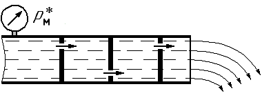 Вода движется по трубопроводу с расходом Q=0,65л/с, последовательно преодолевает три ограничительные шайбы и вытекает в атмосферу. Определить показания манометра Рм*, если диаметры всех отверстий одинаковы и равны dо=8мм. При решении принять коэффици