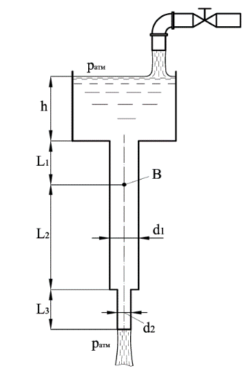 Главная » Учебные материалы » Механика жидкости и газа (МЖГ или Гидравлика) » Решения задач » Несколько классов/семестров » Определить расход воды, вытекающей из трубы, и манометрическое давление в точке В, расположенной на расстоянии L1=9м от дна резервуара. Уровень в резервуаре поддерживается постоянным h=8м. Длина верхнего участка трубы L1=9м и L2=14м, диаметр d1=150мм