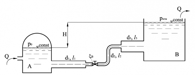 Главная » Учебные материалы » Механика жидкости и газа (МЖГ или Гидравлика) » Решения задач » Несколько классов/семестров » Вода, находящаяся под избыточным давлением p0=140 кПа, из емкости A перетекает в приемную емкость B. Определить расход Q в трубе, если, высота Н=3,3м, коэффициент сопротивления крана ξ=7, радиусы плавных изгибов трубы 120 мм, диаметры трубопровода d1