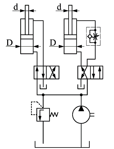 Определить скорость движения поршней гидроцилиндров (D=160 мм, d=80 мм), перемещающихся вверх с одинаковой скоростью, и потери мощности, из-за слива масла через гидроклапан, если давление развиваемое насосом рн=7,5 МПа, подача Qн =30л/мин. Расход масла через дроссель Qдр=7,2 л/мин, объемные КПД гидроцилиндров ηо=0,99. Утечками масла в гидроаппаратуре пренебречь.