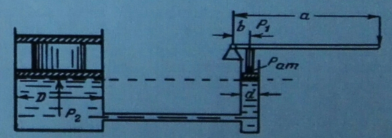 Определите величину сжимающего усилия Р2, производимого одним рабочим у гидравлического пресса, если большее плечо рычага имеет длину а=1м, а малое b=0,1м, диаметр поршня пресса D=250мм, диаметр поршня насоса d=25мм, усилие одного рабочего Р=147Н. Ко