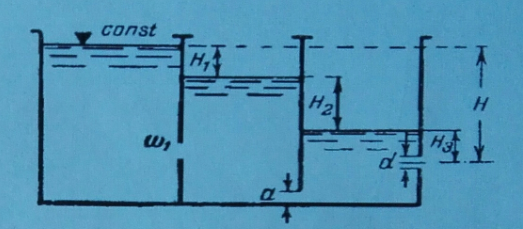 Резервуар разделен на три отсека перегородками, в которых имеются отверстия: в первой перегородке прямоугольное с площадью w1=8,5 см2, во второй перегородке – квадратное, примыкающее одной стороной а=4см ко дну. В наружной стенке отверстие круглое d=3см. Разность между отметкой уровня воды в левом отсеке и отметкой центра наружного отверстия Н=3,1м. Определите расход воды из резервуара Q и напоры Н1, Н2, Н3при установившемся движении при истечении воды из наружного отверстия в атмосферу.