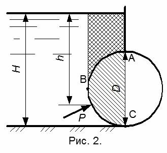 Определить величину, направление и точку приложения силы гидростатического давления воды на 1 метр ширины вальцового затвора диаметром D=2,8м, если уровень воды перед затвором H=3,4м (рис. 2). Плотность воды ρ=1000 кг/м3, ускорение свободного падения g= 9,81 м/с2.