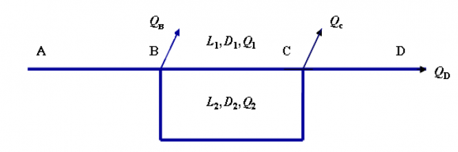 Провести гидравлический расчет элементов сложного трубопровода системы водоснабжения при параллельно-разветвленном соединении труб с насосной установкой, а также рассчитать параметры гидравлического удара в трубопроводе. Исходные данные: 1.1. Горизонтальный трубопровод из стальных труб, схема которого представлена на рис. 1.1, имеет участок с параллельным соединением труб, состоящих из двух линий длиной L1 и L2 и диаметром d1 и d2. В точках В, С и D заданы расходы воды QВ, QС и QD.