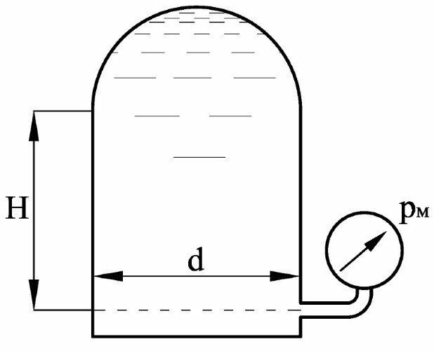 Цилиндрический резервуар заполнен жидкостью (ρ=920 кг/м3), находящейся под избыточным давлением. Дно резервуара плоское, крышка имеет форму полусферы. Определить силу Рх, разрывающую цилиндрическую часть резервуара по образующей, и силу Рz, отрывающую крышку от цилиндрической части, если диаметр d=2,05 м, высота Н=3,0 м, показания манометра Рм=60кПа. Высотой установки манометра пренебречь.