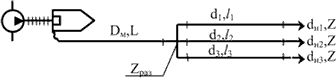 11.22. Определить предельно возможную длину магистральной линии Lм, если из второго ствола (dн2) необходимо получить струю производительностью Q2 = 8,6 л/с. Рукавная система состоит из магистральной линии диаметром Dм = 89 м и трех рабочих линий длинами l1 = 20 м; l2 = 40 м; l3 = 20 м; диаметрами d1 = 66 мм; d2 = 77 мм; d3 = 66 мм и стволами с диаметрами насадков dн1 = 13 мм; dн2 = 16 мм; dн3 = 19 мм. Стволы подняты относительно разветвления на высоту Z1 = 3 м; Z2 = 5 м; Z3 = 7 м, а разветвление установлено относительно оси насоса пожарного автомобиля АНР-40(130) на высоте Zразв= 2 м. Рукава системы прорезиненные.