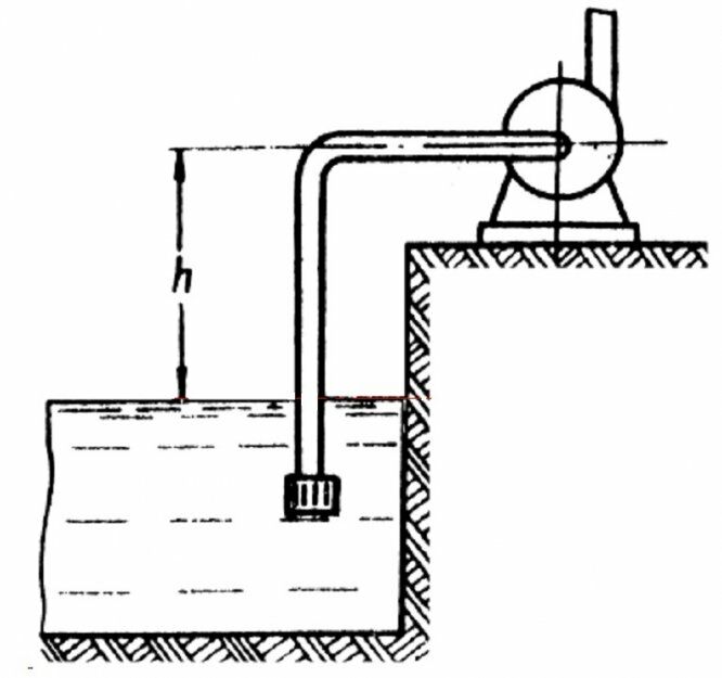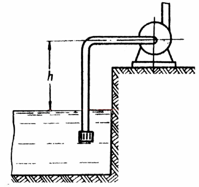 Определить предельную высоту расположения оси центробежного насоса над уровнем воды в водоисточнике h, если расход воды из насоса Q=80 л/с, диаметр всасывающей трубы d=150 мм. Вакуумметрическое давление, создаваемое во всасывающем патрубке Рв=6,5*104Па, потери напора во всасывающей линии 1 м.
