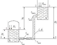 Главная » Учебные материалы » Механика жидкости и газа (МЖГ или Гидравлика) » Решения задач » Несколько классов/семестров » Из резервуара А, заполненного водой и находящегося под манометрическим давлением Рм=0,5 атм, вода подается по стальному трубопроводу длиной l=10 м и диаме тром d=100 мм в резервуар Б на высоту Н=2 м. Коэффициент сопротивлений крана ξкр=9, каждого кол