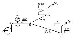 Два цеха обогатительной фабрики С и Д питаются от насосной установки. Манометрическое давление у насоса равно Рм=245,3кПа. Определить расход воды каждого цеха и пьезометрическую отметку цеха Д, если расход воды по магистральному трубопроводу от насоса Q=0,03м3/с. Диаметры труб: d1=0,2м, d2=0,125м, d3=0,15м. Длины труб l1=500м, l3=200м, l3=400м . Трубы водопроводные нормальные.