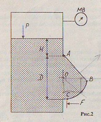 Закрытый резервуар заполнен дизельным топливом, температура которого равна 20oС. В вертикальной стенке резервуара имеется прямоугольное отверстие (Dxb), закрытое крышкой ABC. Крышка может вращаться вокруг горизонтальной оси А. Криволинейная часть крышки ВС имеет центр кривизны в точке О. Мановакуумметр MB показывает манометрическое давление Рм или вакуум Рв над поверхностью жидкости. Расстояние от т. А до поверхности жидкости обозначено Н. Определить усилие F, которое необходимо приложить к нижней части крышки (т. С), чтобы крышка не открывалась. Силой тяжести крышки пренебречь. На схеме показать векторы действующих сил. Исходные данные к задаче: Рм= 4,68 кПа; D=0,9 м: b=2,65 м; Н=1,65 м. ![]()