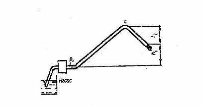 По напорному стальному напорному трубопроводу диаметром D=0,35 м и общей длиной L =50 км вода подается насосом на высоту h1=145 м в количестве Q=6000 м3 за сутки. 1. Определить потерю напора hП в трубопроводе и давление нагнетания рн насоса, учитывая только сопротивление трения по длине, если шероховатость стенок трубопровода Δ=0,2 мм и кинематическая вязкость υ=1,3*10-2Ст. 2. Найти вакуум рв в сечении С расположенном выше выходного сечения трубопровода на h2=35 м, длина участка трубопровода между этими сечениями l=10км.