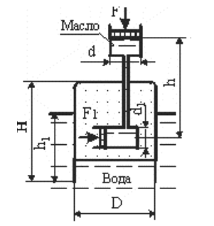 Главная » Учебные материалы » Механика жидкости и газа (МЖГ или Гидравлика) » Решения задач » НГТУ им. Р.Е. Алексеева » Несколько классов/семестров » Номер 1 » Вариант 28 » В колокол диаметром D=1,25м, высотой H=5м и массой m =3000 кг, плавающий в открытом водоеме, встроена гидросистема, состоящая из двух цилиндров диаметрами d=0,2м и d1=0,5d, соединенных вертикальной трубой. Система заполнена маслом (относительная плот