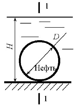 Главная » Учебные материалы » Механика жидкости и газа (МЖГ или Гидравлика) » Решения задач » САФУ им. Ломоносова » Несколько классов/семестров » Номер 4 » Вариант 59 » По дну водоема на глубине Н = 10 м проложен трубопровод диаметром D = 500 мм, по которому под избыточным давлением ри=1,0 МПа перекачивается нефть (ρн=880 кг/м3). Определить усилие, разрывающее трубопровод в плоскости 1-1.