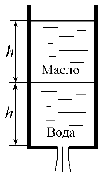 Сосуд заполнен слоями воды и масла (ρм = 800кг/м3) одинаковой высоты h= 1м. Определить время опорожнения сосуда, если диаметр отверстия d = 2 см, площадь горизонтального сечения сосуда Ω= 1 м2.