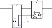 Для заливки центробежного насоса 1 установлен вакуум-насос 2. Какой необходимо создать вакуум, если верх корпуса центробежного насоса находится над уровнем воды в резервуаре на расстоянии H = 3,5 м?