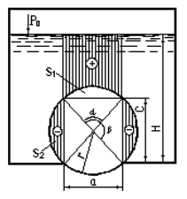Главная » Учебные материалы » Механика жидкости и газа (МЖГ или Гидравлика) » Решения задач » Несколько классов/семестров » Цилиндр радиусом r=25 см и длиной l=100 см перекрывает отверстие в дне резервуара размерами a×b=30×100 см. Определить: силу давления воды на цилиндр при H=3 м, po=pa.