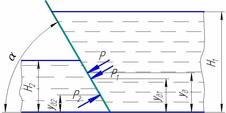 Определить равнодействующую силу и центр давления воды на наклонную прямоугольную стенку шириной b = 10 м, если глубина воды Н1 = 6 м, Н2 = 2 м, а угол наклона стенки α= 60°.