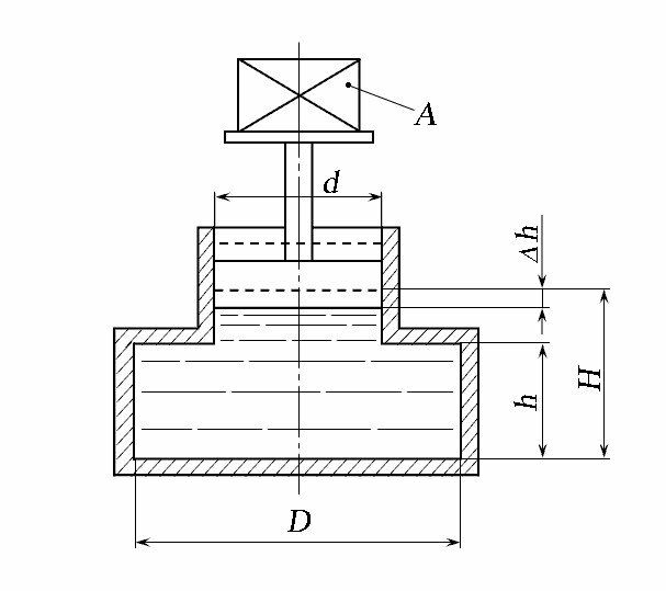 Главная » Учебные материалы » Механика жидкости и газа (МЖГ или Гидравлика) » Решения задач » Несколько классов/семестров » Номер 1 » Вариант 10 » Определить объёмный модуль упругости жидкости, если под действием груза А массой 250 кг поршень прошел расстояние Δh = 5 мм. Начальная высота положения поршня (без груза) H = 1,5 м; диаметр поршня d = 80 мм и резервуара D = 300 мм; высота резервуара