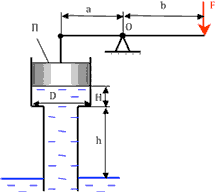 Определить силу F, необходимую для удержания в равновесии поршня П, если труба под поршнем заполнена водой, а размеры трубы: D = 100 мм, H = 0,5 м; h = 4 м. Длины рычага: a = 0,2 м b = 1,0 м. Собственным весом поршня пренебречь.