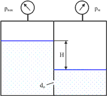Определить направление истечения жидкости (ρ = ρвод) через отверстие do = 5 мм и расход, если разность уровней H = 2 м, показание вакуумметра pвак соответствует 147 мм рт. ст., показание манометра pм = 0,25 МПа, коэффициент расхода μ= 0,62.