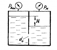 Задача: Определить направление истечения воды через отверстие диаметром d=5 мм и расход, если разность уровней Н = 2 м,