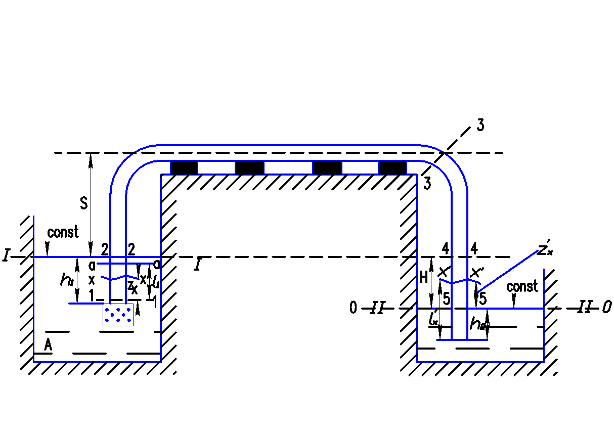Определить, какой расход можно перекачать сифоном из водоема А водоем В при разности горизонтов Н=1,5 м, если длина сифона l=75 м, а диаметр сифона d=200 мм. Трубы чугунные, нормальные (Δ=1,35 мм). Вычислениями выяснить, будет ли в сечениях 1-1, 2-2, 3-3, 4-4, 5-5 манометрическое давление или вакуум. Найти, где расположены сечения, в которых давление в сифоне будет равно атмосферному. Почему в сечении 3-3 будет наибольший вакуум?