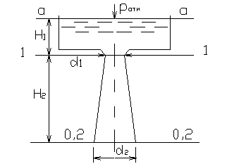 Из открытого резервуара вода вытекает по расширяющейся трубе с диаметрами d1=300 мм и d2 =350 мм , длиной от суженной части до нижнего сечения H2 = 2,5 м. Найти давление p в суженной части трубы при напоре H1= 0,65 м. Потерями напора пренебречь.