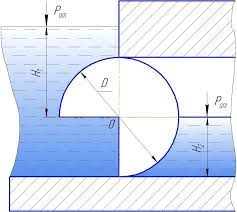 Главная » Учебные материалы » Механика жидкости и газа (МЖГ или Гидравлика) » Решения задач » Несколько классов/семестров » Определить силу гидростатического давления на затвор диаметром Д и длиной В, а также момент в цапфах О, если уровень воды слева выше оси цапф на Н1, а глубина воды справа от щита Н2. (В – перпендикулярно плоскости чертежа). Указание. Ось вращения и ц