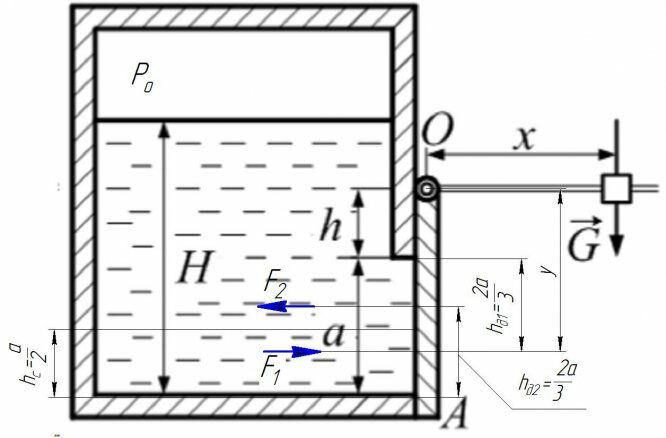 Для студентов по предмету Механика жидкости и газа (МЖГ или Гидравлика)Квадратное отверстие со стороной а = 0,6 м в стенке резервуара с водой закрыто щитом ОА, который прижимается грузом G, подвешенным на рычаге длиной х Квадратное отверстие со стороной а = 0,6 м в стенке резервуара с водой закрыто щитом ОА, который прижимается грузом G, подвешенным на рычаге длиной х