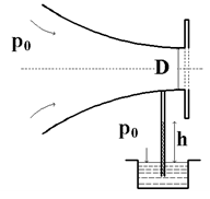 Центробежный вентилятор засасывает воздух из атмосферы через сопло. К цилиндрической части сопла диаметром D присоединена стеклянная трубка, нижним концом опущенная в сосуд с водой. Определить количество нагнетаемого вентилятором воздуха, если вода в трубке поднялась на высоту h. Потери не учитывать.