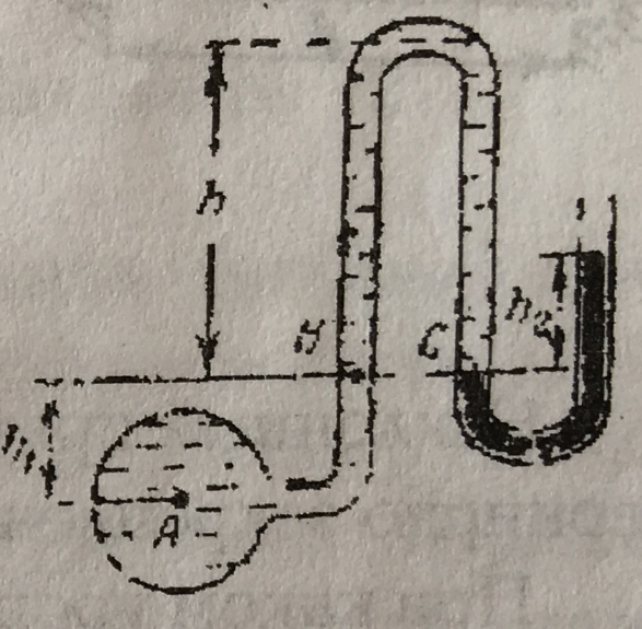 Определите избыточное давление в точке А трубопровода, если высота столба ртути по пьезометру h2=45 см, центр трубопровода расположен на h1=25 см ниже линии раздела между жидкостью и ртутью ρрт=13600 кг/м3; ρ=1000 кг/м3