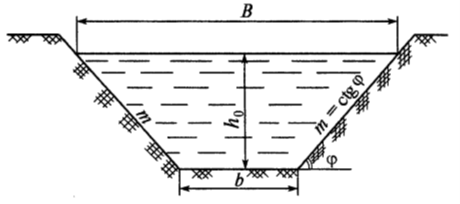 Главная » Учебные материалы » Механика жидкости и газа (МЖГ или Гидравлика) » Решения задач » Несколько классов/семестров » Трапецеидальный канал с крутизной откосов m и коэффициентом шероховатости стенок п=0,025, имеющий ширину по дну b, проложен с уклоном дна i. Требуется определить: 1 . Глубину воды в канале при пропуске расхода Q. 2. Ширину канала по верху (по урезу в