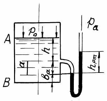 Главная » Учебные материалы » Механика жидкости и газа (МЖГ или Гидравлика) » Решения задач » Несколько классов/семестров » Определить давление на поверхность воды в закрытом сосуде, если ртутный манометр показывает разность уровней ртути hрт=190 мм. Известно: h=1,4 м, a=0,8 м, b=0,3 м. Построить эпюру гидростатического давления на плоскую поверхность