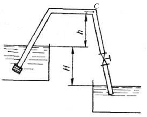 10.65. Из одного резервуара в другой вода поступает по сифонному трубопроводу длинной l = 50 м и диаметром d = 75 мм. Определить расход воды Q при разности уровней в резервуарах H = 5 м. Трубопровод снабжен приемным клапаном с сеткой (ξкл = 5) и задвижкой (ξзад = 4). Потерями напора в коленах и на выход из трубы пренебречь. Коэффициент сопротивления трения λ = 0,03. Найти вакуум в опасной точке сифона, если длина участка трубопровода до этой точки l1= 30 м и ее возвышения над уровнем воды в верхнем резервуаре h = 2 м.