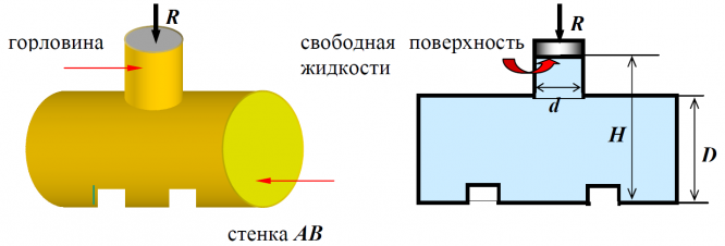 Главная » Учебные материалы » Механика жидкости и газа (МЖГ или Гидравлика) » Решения задач » УГТУ » Несколько классов/семестров » Номер 5 » Вариант 4 » Определить суммарную силу давления на торцевую стенку AB горизонтальной цилиндрической цистерны диаметром D, заполненной жидкостью плотностью ρ, находящейся при температуре t°C. Уровень жидкости в горловине находится на расстоянии H от дна. Горловина