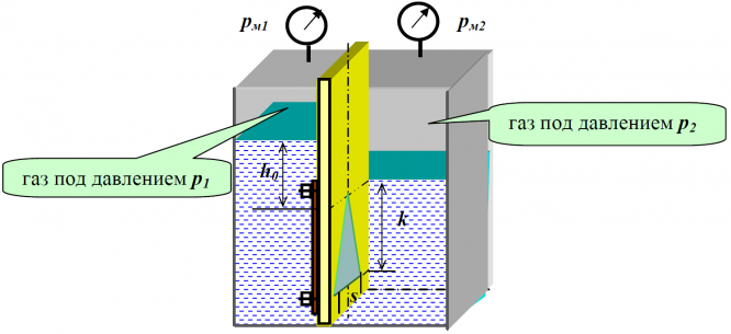 Герметически закрытый сосуд разделен перегородкой на два отсека. В перегородке сделано треугольное отверстие, закрытое крышкой. Крышка крепится к перегородке болтами. Над жидкостью в отсеках находится газ под разным давлением, измеряемым с помощью ма