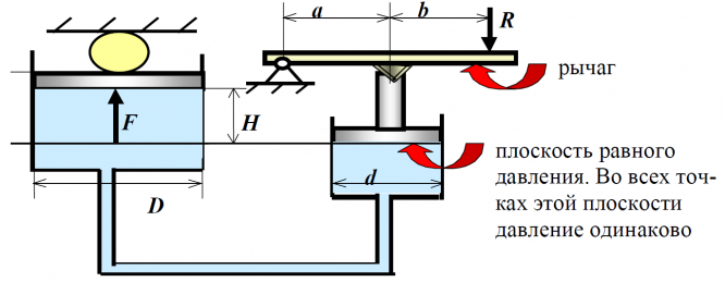 Определить силу прессования F, развиваемую гидравлическим прессом. Диаметр большого плунжера равен D, а малого d. Большой плунжер расположен выше меньшего на величину H, усилие, приложенное к рукоятке, равно R. Температура жидкости 20°С. Рычаг отсутствует, и сила R приложена непосредственно к поршню малого диаметра. Дано: D=0,2 м; d=0,05 м; R=90 Н; b=0 мм; а=0 мм; H=0,8 м; жидкость – вода.