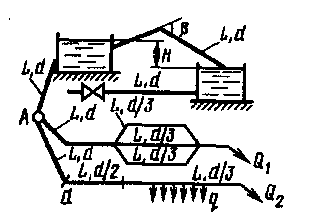 От пункта А проложена водопроводная сеть: с последовательным и параллельным соединениями стальных, бывших в эксплуатации, трубопроводов, к двум водоемам на разных отметках и постоянной разницей уровней Н. Вода подается из одного водоема в другой посредством сифона с углами поворота α и β, выполненного из стального трубопровода диаметром d. От нижнего водоема отходит стальной трубопровод длиной L и диаметром d, заканчивающийся задвижкой. На последнем участке последовательного соединения трубопроводов имеется равномерно распределенный путевой объемный расход q и объемный расход в конце трубопровода Q2. Определить: 1. Объемный расход в сифоне. 2. Распределение объемного расхода воды Q1 в параллельных ветвях водопровода. 3. Потери напора по длине трубопровода на участках последовательного соединения. 4. Повышение давления Δp в трубопроводе при внезапном закрытии задвижки. Дано: Н=1 м; α=45°; β=60°; d=0,6 м; L=108 м; q=0,04 л/с; Q2=1,1⋅10-4 м3/с; Q1=6⋅10-4 м3/с; e=7 мм; υ0=1,3 м/с.