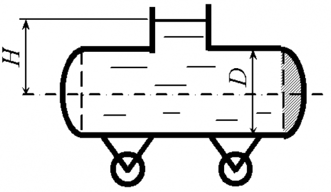 Определить горизонтальную и вертикальную составляющие силы гидростатического давления нефти плотностью ρ= 850 кг/м3 на выпуклую торцовую стенку, если D = 3,5 м, Н = 2,1 м, а объем выпуклой части (на рис. заштрихован) V = l,5 м3.
