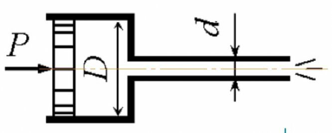Для студентов САФУ им. Ломоносова по предмету Механика жидкости и газа (МЖГ или Гидравлика)Поршень диаметром D = 200 мм вытесняет воду по короткому трубопроводу диаметром d = 20 мм в атмосферу. Определить усилие на поршень, если скорость истПоршень диаметром D = 200 мм вытесняет воду по короткому трубопроводу диаметром d = 20 мм в атмосферу. Определить усилие на поршень, если скорость ист
