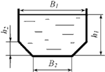 Для сечения канала, которое представлено на рисунке, построить зависимость расхода от глубины заполнения, если В1 = 4,0 м, В2 = 2,0 м, h2= 1,0 м, уклон дна i = 0,0006, коэффициент шероховатости n = 0,017.