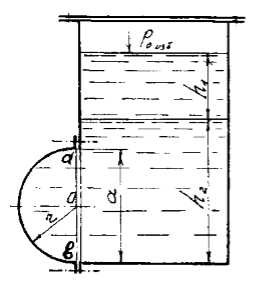 В герметично закрытый резервуар налиты вода (ρв = 1000 кг/м3), глубина которой h2 = 1,6 м, и масло, слой которого составляет h1 = 0,5 м, при плотности ρм = 800 кг/м3. На свободной поверхности масла действует избыточное давление р0= 15 кПа. Определить силу давления на цилиндрическую крышку AB радиусом r = 0,7 м, закрывающую прямоугольное отверстие высотой a = 1,4 м и шириной b = 1,2 м.