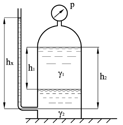 В геометрически закрытом сосуде налиты две не смешивающиеся жидкости. Удельный вес жидкости, образующей верхний слой γ1 равен 8 кН/м3, толщина h1=3 м. Удельный вес жидкости нижнего слоя γ2=10 кН/м3. Открытый пьезометр присоединен на глубине h2=5 м от свободной поверхности. Показание манометра Р=16 кПа.nОпределить высоту hx, на которую поднимется жидкость в пьезометре.